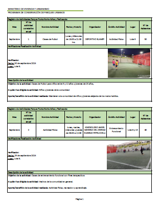 Plan de uso Parque Urbano «Punta Norte» Con el fin de poder informar a la comunidad de las distintas actividades realizadas por los vecinos en nuestro Parque Urbano “Punta Norte”, se presenta en el siguiente enlace con las diversas actividades deportivas, recreativas comunitarias y sociales desarrolladas en el mes de septiembre. Enlace a las actividades